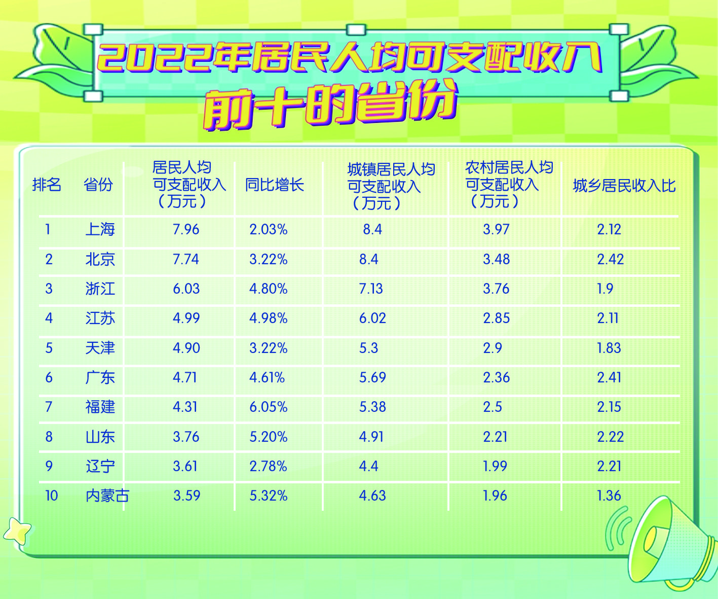 與2021年相比,上海、北京、浙江的居民人均可支配收入仍穩(wěn)居前三,分別為79610元、77415元和60302元,同比增長(zhǎng)了2.03%、3.22%和4.8%。