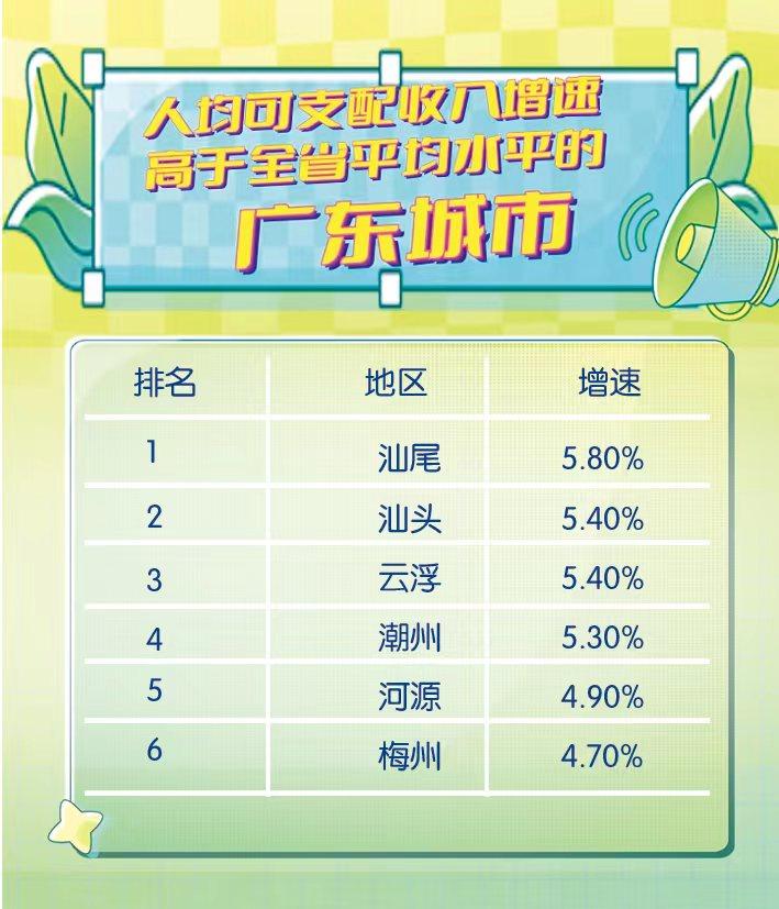 緊隨其后躋身6萬元俱樂部的城市分別為佛山和珠海,中山居民的人均可支配收入距離6萬元僅剩一步之遙,達(dá)到了5.98萬元。在已經(jīng)公布數(shù)據(jù)的城市中,珠三角城市居民收入在全省排名較前。而從收入增速來看,粵東地區(qū)遙遙領(lǐng)先,其中,汕尾、汕頭、潮州收入增速分別達(dá)到了5.8%、5.4%和5.3%。