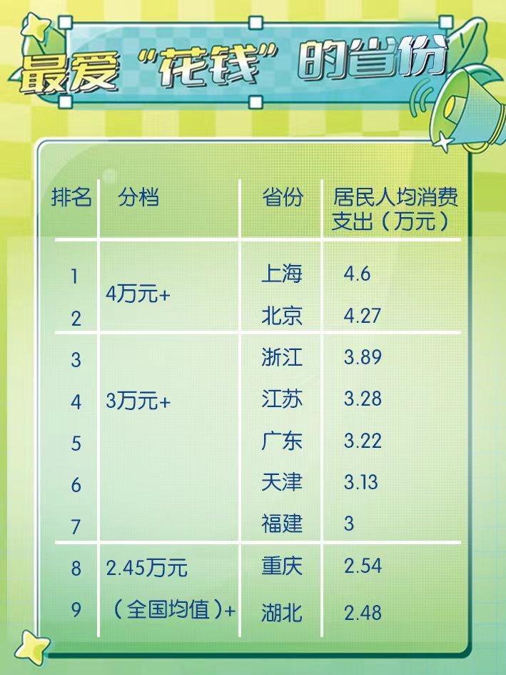 羊城晚報(bào)記者梳理發(fā)現(xiàn),31個(gè)省份中,頭部梯隊(duì)為4萬元+檔次,主要為直轄市,第二梯度則集中于2.5萬—4萬元區(qū)間,主要集中在東部沿海地區(qū),共有9個(gè)省市的人均消費(fèi)支出高于全國(guó)水平。