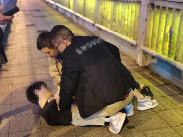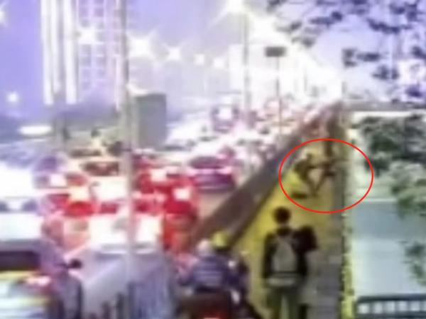 一名年輕男子欲跳橋,熱心路人奮力拉扯阻攔。