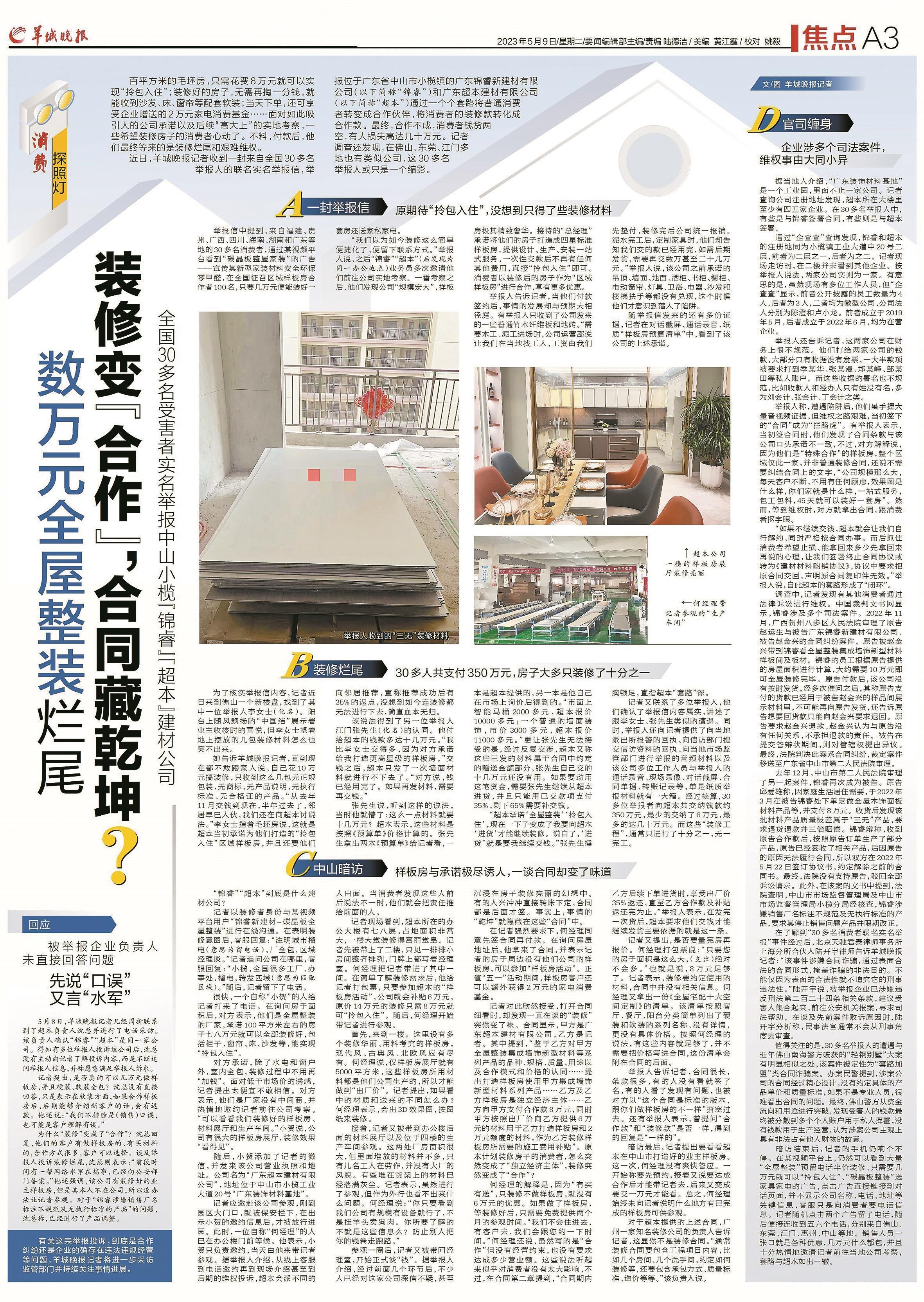 5月9日至11日,羊城晚報推出《數(shù)萬元全屋整裝爛尾 裝修變“合作”,合同藏乾坤?全國30多名受害者實名舉報中山小欖“錦!薄俺尽苯ú墓尽贰队浾咴僭L“超本” 樣板房活動沒了》《超本“沈總”約記者面談 最終卻沒有露面》等多篇獨家報道,揭露了廣東省中山市小欖鎮(zhèn)的廣東錦睿新建材有限公司(以下簡稱“錦睿”)和廣東超本建材有限公司(以下簡稱“超本”)通過一個個套路將普通消費者轉(zhuǎn)變成合作伙伴,將消費者的裝修款轉(zhuǎn)化成合作款。最終,合作不成,消費者錢貨兩空,有人損失高達(dá)幾十萬元。