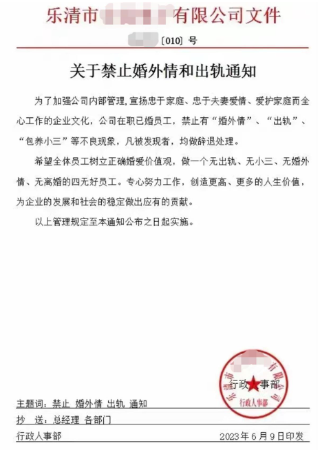 近日,一張溫州樂(lè)清市某企業(yè)“關(guān)于禁止婚外情和出軌通知”的圖片在網(wǎng)上流傳:“為了加強(qiáng)公司內(nèi)部管理,宣揚(yáng)忠于家庭、忠于夫妻愛情、愛護(hù)家庭而全心工作的企業(yè)文化,公司在職已婚員工,禁止有‘婚外情’‘出軌’‘包養(yǎng)小三’等不良現(xiàn)象,凡被發(fā)現(xiàn)者,均做辭退處理。希望全體員工樹立正確婚愛價(jià)值觀,做一個(gè)無(wú)出軌、無(wú)小三、無(wú)婚外情、無(wú)離婚的四無(wú)好員工。專心努力工作,創(chuàng)造更高、更多的人生價(jià)值,為企業(yè)的發(fā)展和社會(huì)的穩(wěn)定做出應(yīng)有的貢獻(xiàn)。”圖片顯示,該通知由企業(yè)行政人事部2023年6月9日印發(fā)。