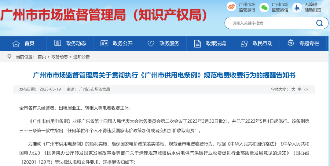廣州市市場監(jiān)督管理局還專門發(fā)布了關(guān)于貫徹執(zhí)行《廣州市供用電條例》規(guī)范電費(fèi)收費(fèi)行為的提醒告知書,要求各電費(fèi)收費(fèi)主體(包括但不限于村社集體物業(yè)經(jīng)營管理方、出租屋主、二房東,下同)按價(jià)格主管部門公布的目錄銷售電價(jià)收取電費(fèi),不得擅自提高價(jià)格標(biāo)準(zhǔn),并提醒各電費(fèi)收費(fèi)主體立即開展自查自糾。