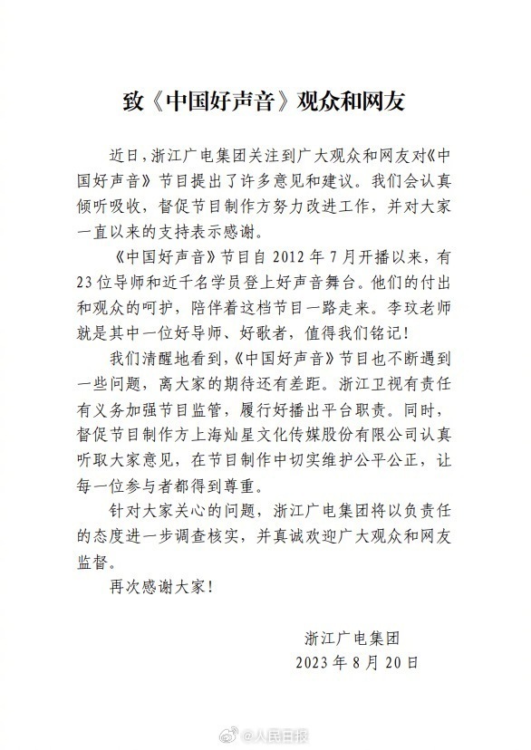 20日晚,浙江廣電集團(tuán)就近期《中國(guó)好聲音》節(jié)目引發(fā)的爭(zhēng)議作出回應(yīng),表示將進(jìn)一步調(diào)查核實(shí),并真誠(chéng)歡迎廣大觀眾和網(wǎng)友監(jiān)督。