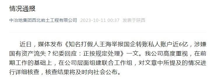 10月11日,中冶地集團西北巖土工程有限公司微信公號發(fā)布回應:近日,媒體發(fā)布《知名打假人王海舉報國企轉賬私人賬戶近6億,涉嫌國有資產流失?紀委回應:正按規(guī)定處理》一文。我公司高度重視,在前期工作的基礎上,在公司層面組建聯合工作組,對文章中所提及的情況進行詳細核查,核查結果將及時向社會公布。