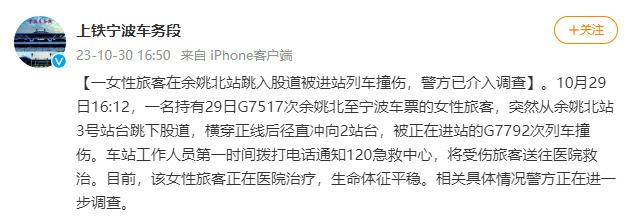上鐵寧波車務段最新消息:10月29日16:12,一名持有29日G7517次余姚北至寧波車票的女性旅客,突然從余姚北站3號站臺跳下股道,橫穿正線后徑直沖向2站臺,被正在進站的G7792次列車撞傷。車站工作人員第一時間撥打電話通知120急救中心,將受傷旅客送往醫(yī)院救治。目前,該女性旅客正在醫(yī)院治療,生命體征平穩(wěn)。相關具體情況警方正在進一步調查。