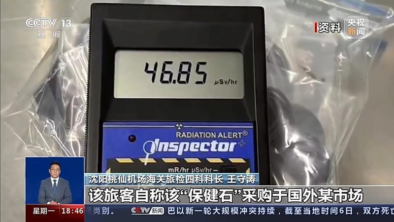 沈陽桃仙機(jī)場海關(guān)旅檢四科科長 王守濤:一旅客通過我身后的固定式核輻射監(jiān)測門觸發(fā)報警,經(jīng)過我們復(fù)查確認(rèn),該旅客隨身攜帶的“保健石”項(xiàng)鏈核輻射超標(biāo),經(jīng)過測量輻射值達(dá)到46.85微西弗/小時,超現(xiàn)場本底值468倍。該旅客自稱該“保健石”采購于國外某市場,賣家稱該保健石具有養(yǎng)生保健、防病防癌、延年益壽的功效。