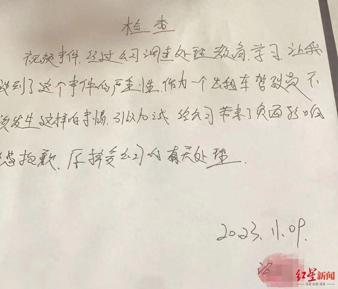 紅星新聞記者獲得的一份當(dāng)事出租車司機手寫的事件經(jīng)過顯示,事發(fā)11月7日晚,當(dāng)時“我和朋友一起拍了一個視頻,朋友在后面拍了一個我和女朋友的短視頻,視頻上有不文明的行為。經(jīng)過公司教育學(xué)習(xí),讓我認(rèn)識到了這個事情的嚴(yán)重性,作為一個出租車駕駛員,不該發(fā)生這樣的事情,引以為戒。”