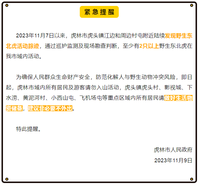 為確保人民群眾生命財產(chǎn)安全,防范化解人與野生動物沖突風(fēng)險,即日起,虎林市域內(nèi)所有居民及游客請勿入山活動,虎頭鎮(zhèn)虎頭村、影視城、下水澇、黃泥河村、小西山屯、飛機場屯等重點區(qū)域內(nèi)所有居民請做好生活物資儲備,建議非必要不外出。