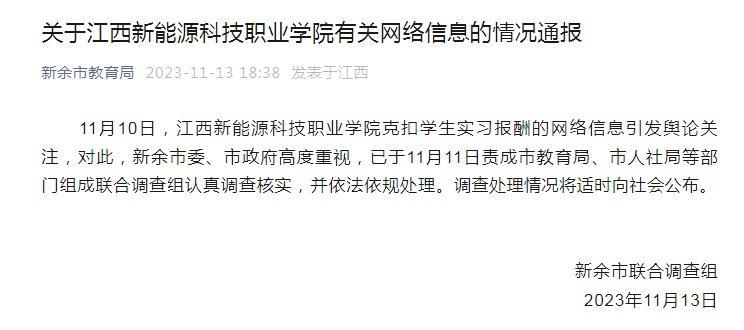 通報(bào)稱(chēng),11月10日,“江西新能源科技職業(yè)學(xué)院克扣學(xué)生實(shí)習(xí)報(bào)酬”的網(wǎng)絡(luò)信息引發(fā)輿論關(guān)注,對(duì)此,新余市委、市政府高度重視,已于11月11日責(zé)成市教育局、市人社局等部門(mén)組成聯(lián)合調(diào)查組認(rèn)真調(diào)查核實(shí),并依法依規(guī)處理。調(diào)查處理情況將適時(shí)向社會(huì)公布。