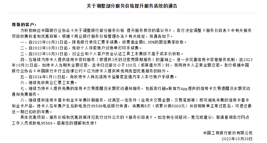 公告指出,自2023年10月31日起,繼續(xù)為持卡人提供免費(fèi)的信用卡交易提醒及余額變動通知服務(wù);免收持卡人轉(zhuǎn)出信用卡溢繳款至境內(nèi)本人本行賬戶手續(xù)費(fèi);繼續(xù)提供信用卡普卡和金卡年費(fèi)補(bǔ)刷機(jī)制;繼續(xù)提供信用卡容時、容差服務(wù)機(jī)制。