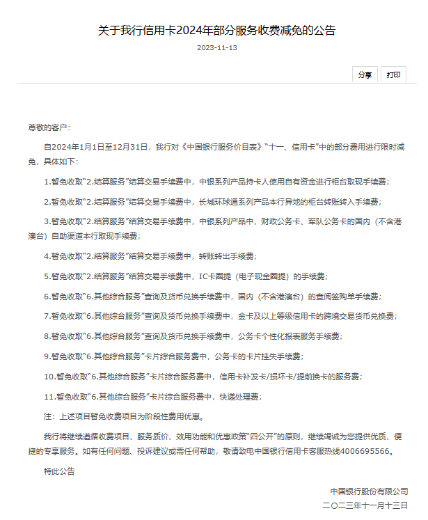 中國銀行表示,本次部分費(fèi)用減免為階段性費(fèi)用優(yōu)惠,時間為2024年1月1日至12月31日。