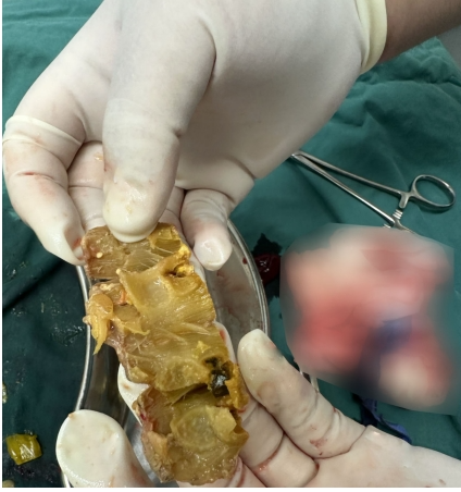 之后,手術(shù)團(tuán)隊(duì)將胡大姐的小腸切開一個(gè)口子,取出了一塊大約8cm長(zhǎng)的堵塞物,被堵塞的腸壁周圍已經(jīng)充滿淤血,呈現(xiàn)出缺血狀態(tài),只能切除約25cm的小腸,以防術(shù)后發(fā)生腸瘺。一個(gè)半小時(shí)后,手術(shù)成功。