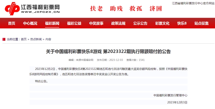12月2日,中國福利彩票“快樂8”第2023322期開獎,按照以往開獎信息發(fā)布速度,開獎情況大概每天22時左右就會出爐,可是當晚足足晚了一個多小時!斑x七”和“選五”中獎無數(shù),把獎池都中爆了,均觸發(fā)最大返獎總額風險控制。按照《中國福利彩票快樂8游戲風險控制方案》,各獎等單注中獎獎金以開獎公告為準。