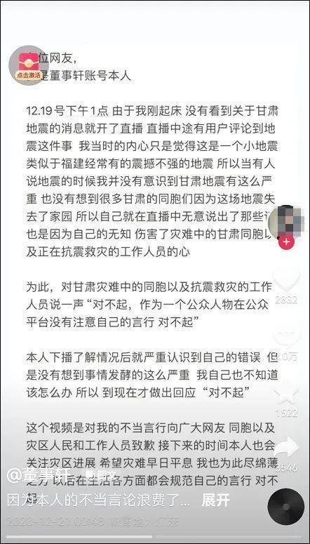 據(jù)報(bào)道,12月19日,在網(wǎng)紅董事軒的直播間,有網(wǎng)友提到“甘肅地震了”。董事軒看到后竟笑著回應(yīng):“甘肅地震了,啊?甘肅地震離我800公里遠(yuǎn),跟我有什么關(guān)系嗎?”