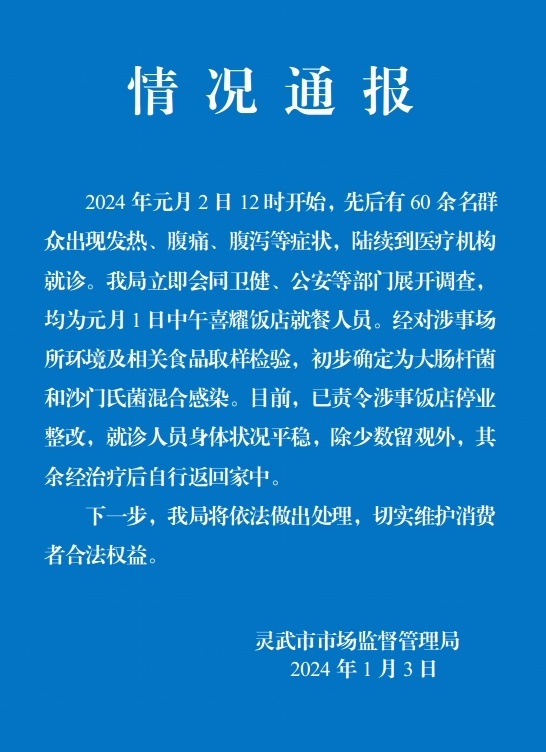 據靈武市監(jiān)局通報:1月2日12時開始,先后有60余名群眾出現(xiàn)發(fā)熱、腹痛、腹瀉等癥狀,陸續(xù)到醫(yī)療機構就診。我局立即會同衛(wèi)健、公安等部門展開調查,均為1月1日中午喜耀飯店就餐人員。經對涉事場所環(huán)境及相關食品取樣檢驗,初步確定為大腸桿菌和沙門氏菌混合感染。