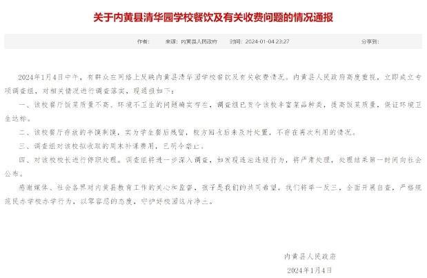2024年1月4日中午,有群眾在網(wǎng)絡(luò)上反映內(nèi)黃縣清華園學(xué)校餐飲及有關(guān)收費情況。內(nèi)黃縣人民政府高度重視,立即成立專項調(diào)查組,對相關(guān)情況進行調(diào)查落實,現(xiàn)通報如下: