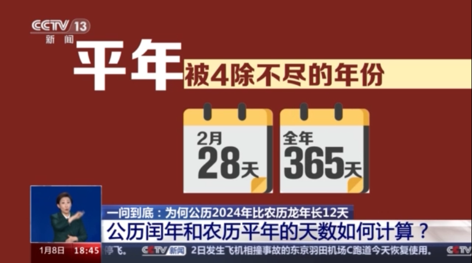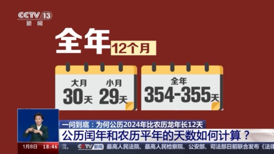 北京天文館副館長 齊銳:公歷是靠觀測太陽的運動來得到的這個歷法。因此,地球圍繞太陽運動的公轉(zhuǎn)的這個周期,我們天文學(xué)上叫回歸年,這個長度是公歷年長的決定因素。天文學(xué)觀測,我們得知,回歸年的長度是365.2422天,因此這個公歷的年長,就要向這個數(shù)值去逼近。從2024年來看,公歷是閏年,2月有29天,因此它的年長是366天。 農(nóng)歷要考慮月亮的運動,因此,每個月它的月長是要看月相的陰晴圓缺的變化周期,朔望月的周期是29天半多一點,因此農(nóng)歷的每個月的月長無非就是29天或者是30天,甲辰龍年,它是一個農(nóng)歷上的平年,它這一年只有12個農(nóng)歷月,因此年長是354天。
