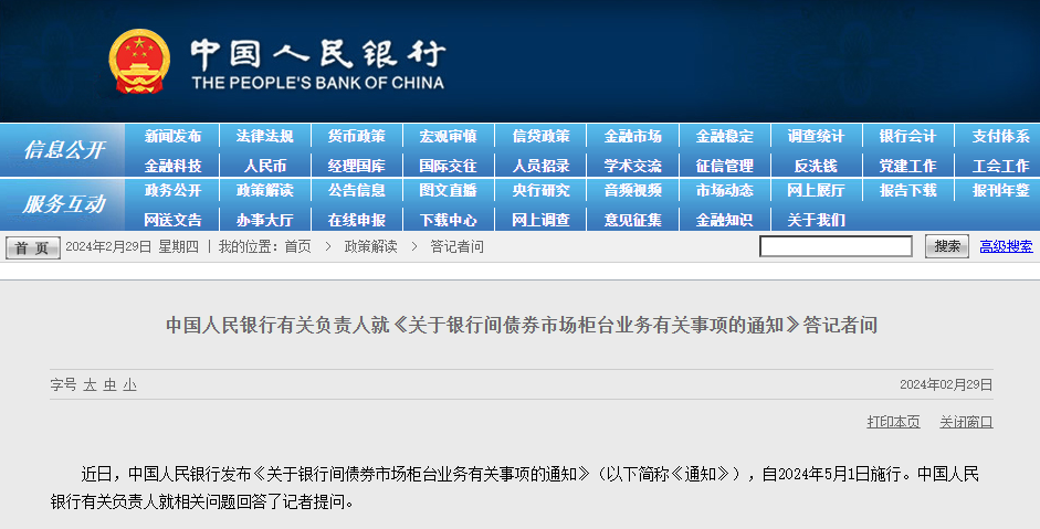 2月29日,中國(guó)人民銀行官網(wǎng)發(fā)布消息,近日,中國(guó)人民銀行發(fā)布《關(guān)于銀行間債券市場(chǎng)柜臺(tái)業(yè)務(wù)有關(guān)事項(xiàng)的通知》(以下簡(jiǎn)稱《通知》),自2024年5月1日施行。中國(guó)人民銀行有關(guān)負(fù)責(zé)人就相關(guān)問題回答了記者提問。