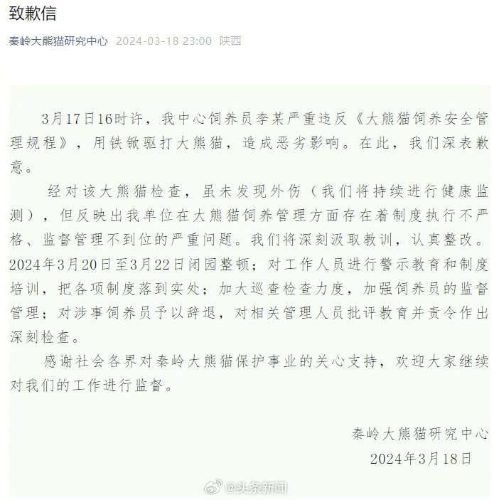3月18日晚,秦嶺大熊貓研究中心發(fā)布致歉信稱,3月17日16時許,該中心飼養(yǎng)員李某嚴(yán)重違反《大熊貓飼養(yǎng)安全管理規(guī)程》,用鐵锨驅(qū)打大熊貓,造成惡劣影響。在此,秦嶺大熊貓研究中心深表歉意。