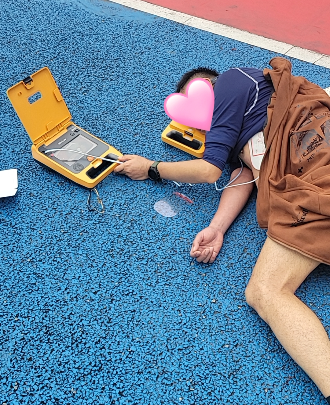 “我用力拍打跑者的雙肩,大聲在他耳旁呼叫,‘朋友,你還好嗎?你能聽到嗎?’”張;貞浀。見男子沒有反應(yīng),呼吸微弱,并且觸診頸動(dòng)脈發(fā)現(xiàn)無搏動(dòng)后,張睿馬上開始為他實(shí)施胸外按壓、開放氣道做人工呼吸,并且讓趕到的保安去拿AED(全稱為自動(dòng)體外除顫器)。經(jīng)過幾個(gè)循環(huán)的胸外按壓-人工呼吸后,男子的頸動(dòng)脈仍無搏動(dòng),此時(shí)保安攜帶AED到場(chǎng),張睿繼續(xù)心肺復(fù)蘇,叮囑保安打開AED機(jī)器及除顫電極片,把電極片分別貼在倒地男子的左胸腋中線第5肋間和右胸鎖骨中線第2肋間后,AED自動(dòng)分析患者心電,并提示“除顫”。