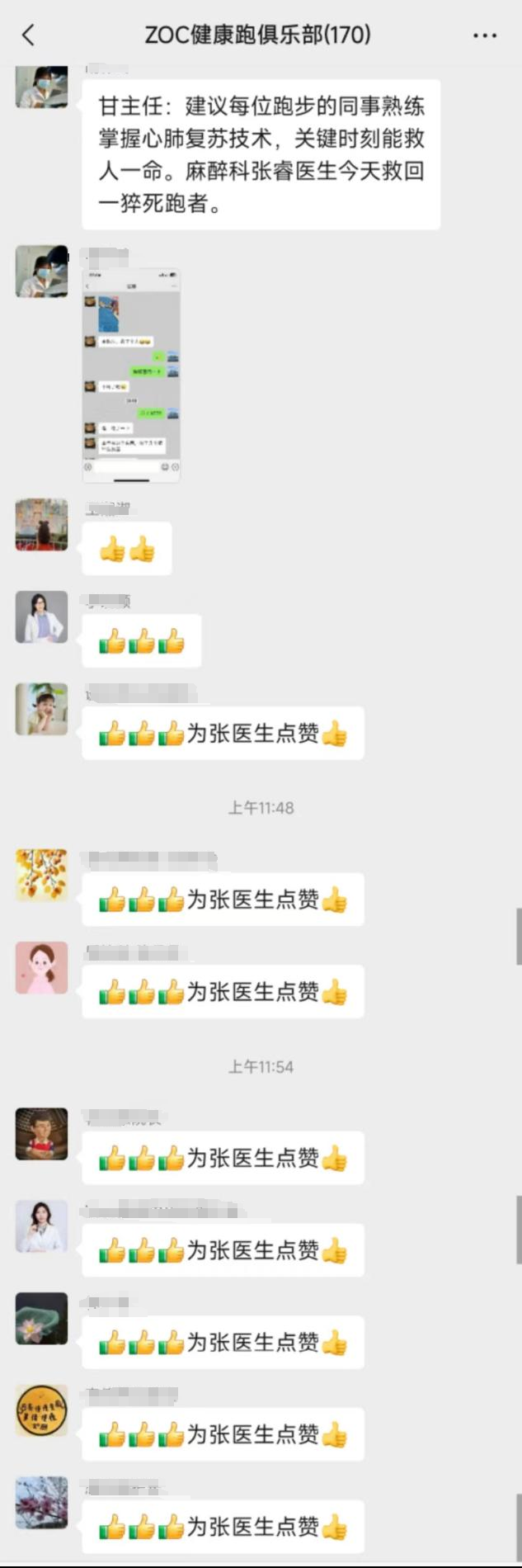 中山眼科中心跑步群中的跑友紛紛為張睿醫(yī)生點(diǎn)贊