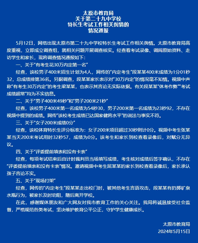5月15日,太原市教育局就該事件發(fā)布情況通報稱,太原市教育局高度重視,立即成立調查組,就相關問題開展調查核實。經查看考試錄像、調閱原始資料、走訪學生和家長,調查情況通報如下: