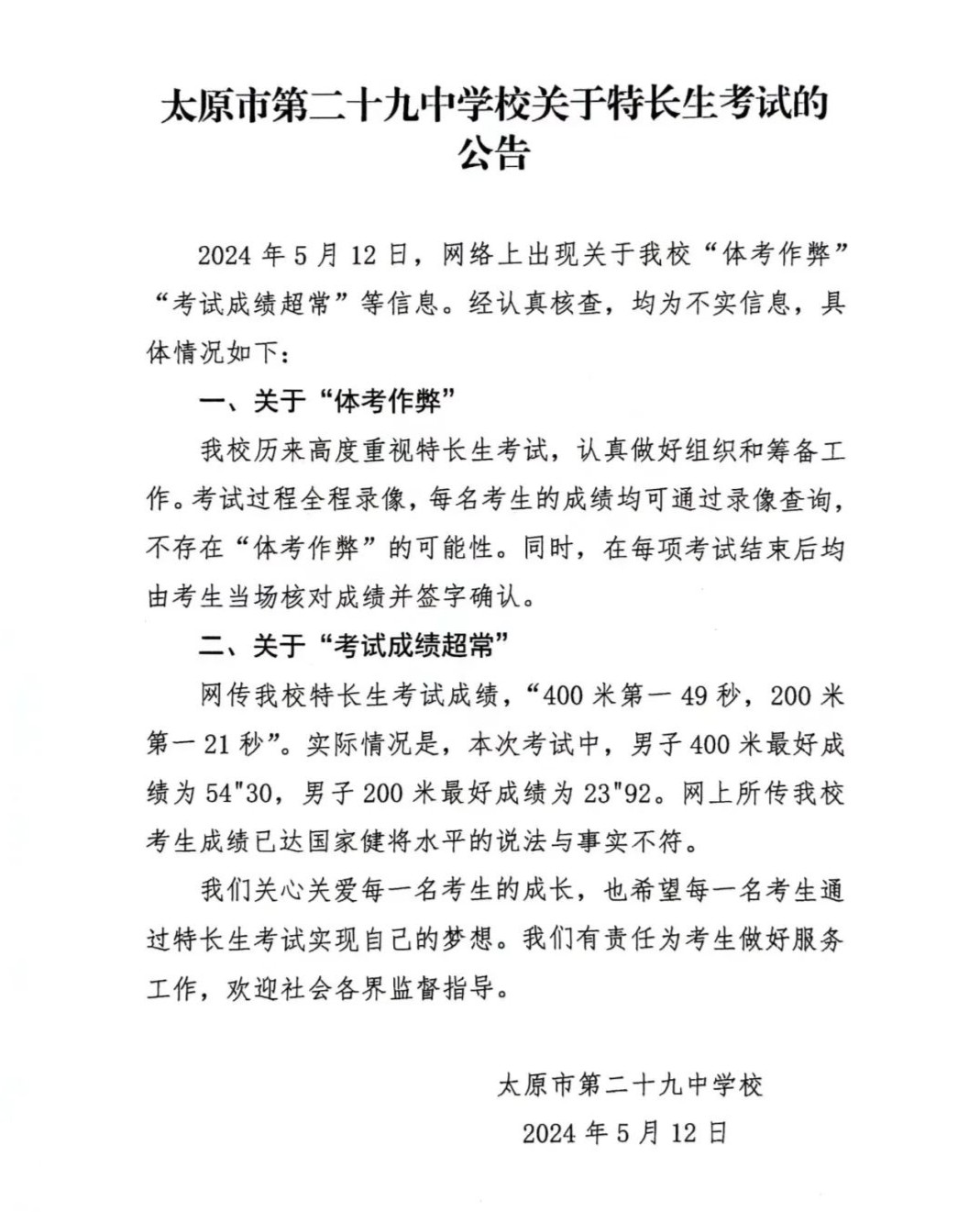 5月12日,網絡上出現(xiàn)關于山西省太原市第二十九中學!绑w考作弊”“考試成績超常”等信息,引發(fā)社會廣泛關注。當天深夜,太原市第二十九中學校就該事件發(fā)布公告稱,經認真核查,上述信息均為不實信息。