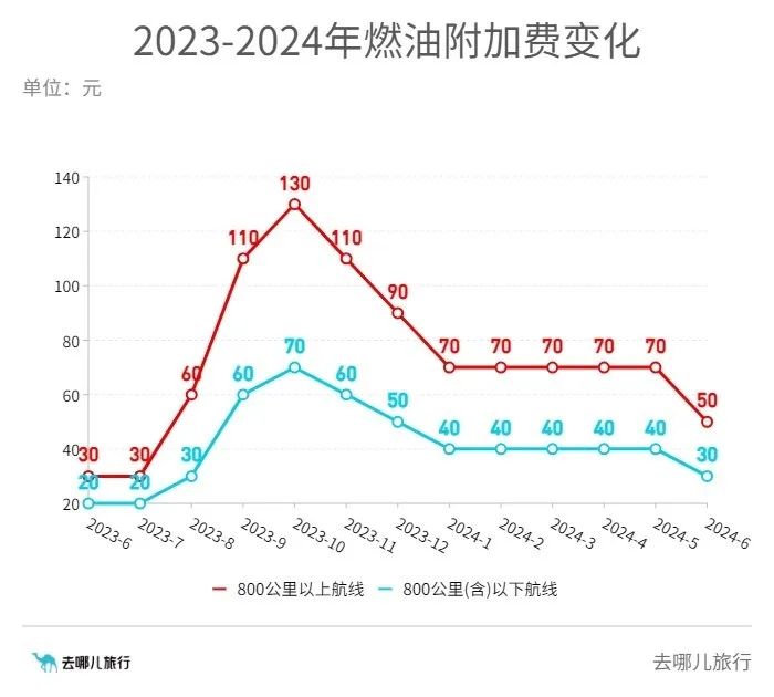 此外,5月29日,去哪兒也接到河北航空消息:自2024年6月5日(出票日期)起,成人旅客:800公里以上航線每位旅客收取50元燃油附加費,800公里(含)以下航線每位旅客收取30元燃油附加費。相較于調(diào)整前分別降低了20元和10元。燃油附加費降低,有助于減少端午出游成本。