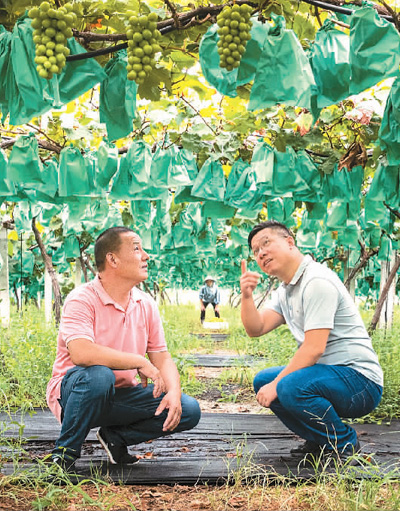 陳李波(右)在崇賢村葡萄種植園與農(nóng)戶一起察看葡萄長勢。