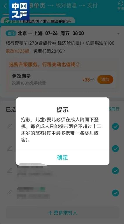 記者在某在線票務平臺機票預訂頁面添加1名成人旅客和3名兒童時,平臺跳出了“每名成人只能攜帶兩名不超過十二周歲的旅客(其中最多攜帶一名嬰兒旅客)”的彈窗提示。而這趟航班由國航運營,按照規(guī)定,可以攜帶3名5歲以下兒童乘機。