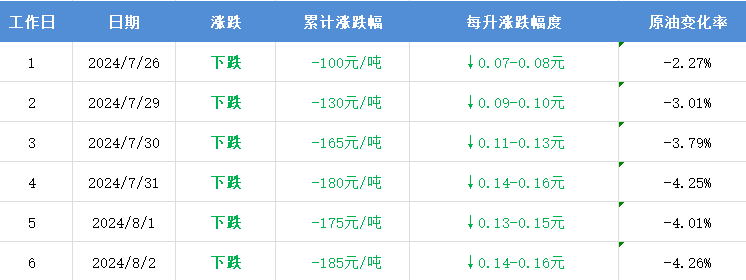國(guó)內(nèi)油價(jià)將在8月8日24時(shí)(本周四晚12點(diǎn))進(jìn)行下半年第3次調(diào)整。本輪國(guó)內(nèi)油價(jià)計(jì)價(jià)統(tǒng)計(jì)周期第6個(gè)工作日,參考原油變化率-4.26%,預(yù)計(jì)汽柴油下調(diào)185元/噸,折算為每升油價(jià)下跌0.14-0.16元。