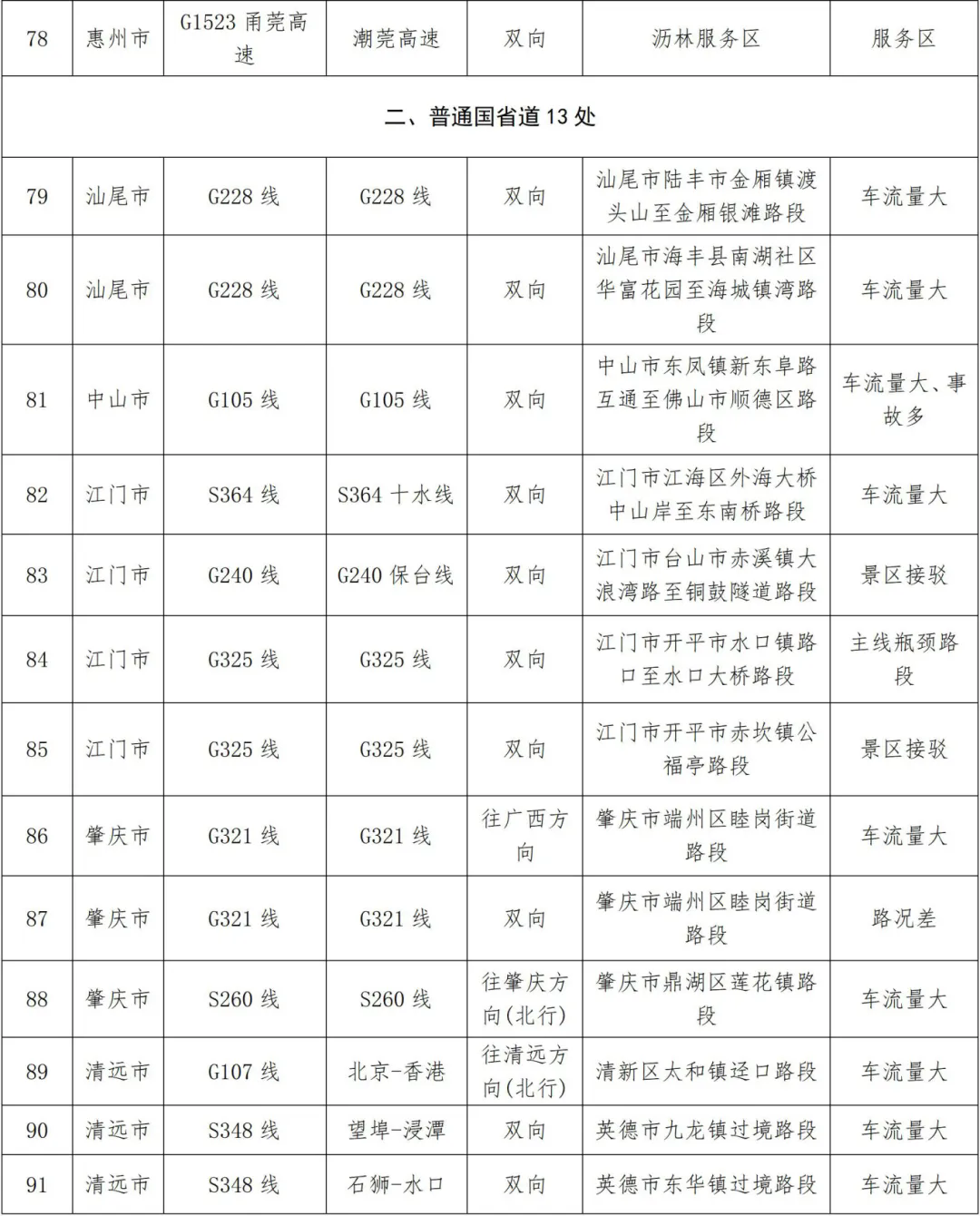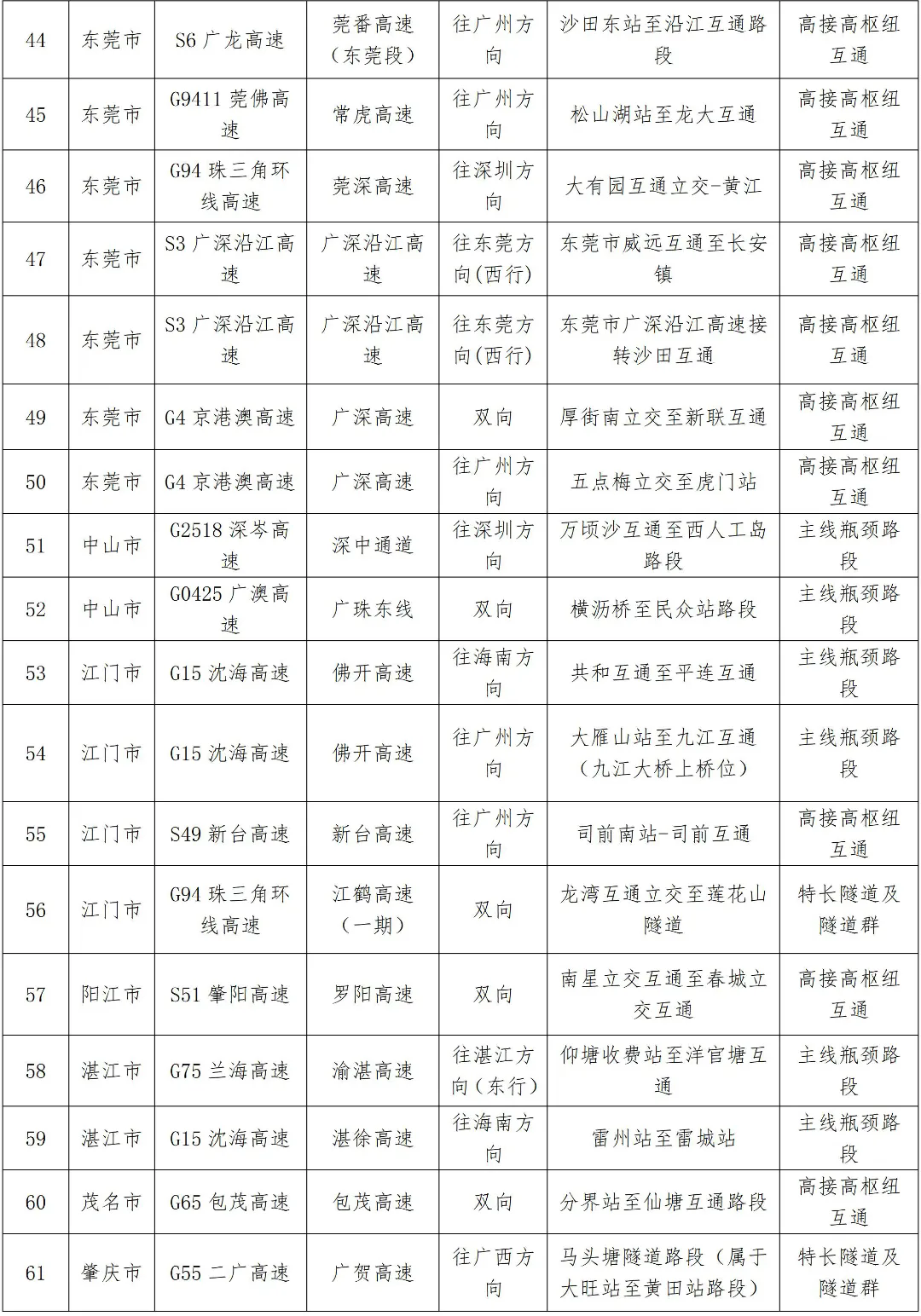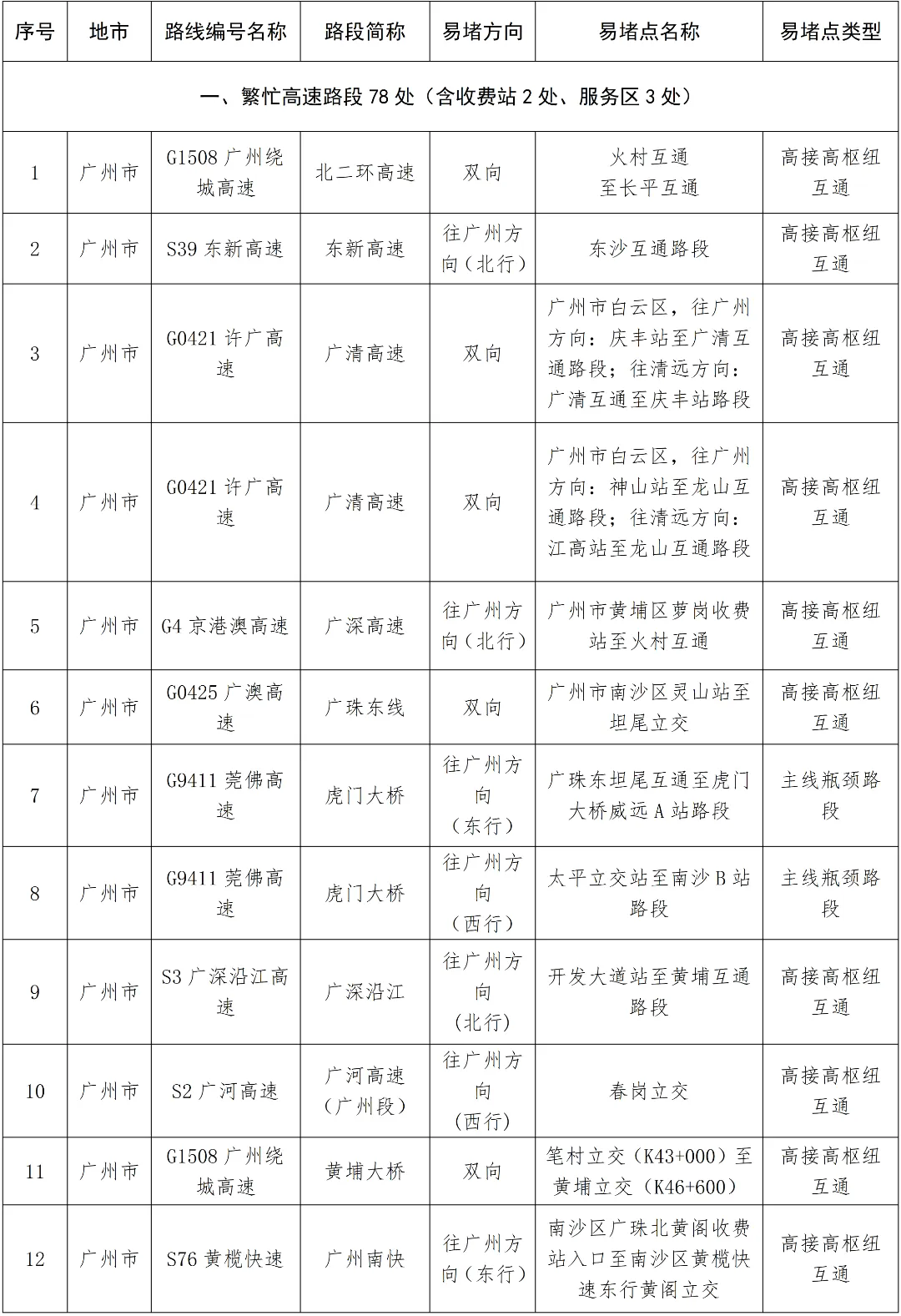 預計繁忙路段一覽表