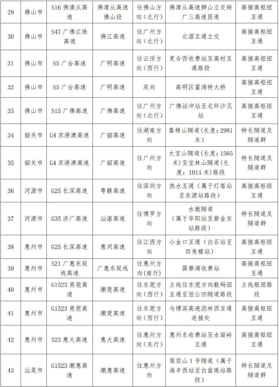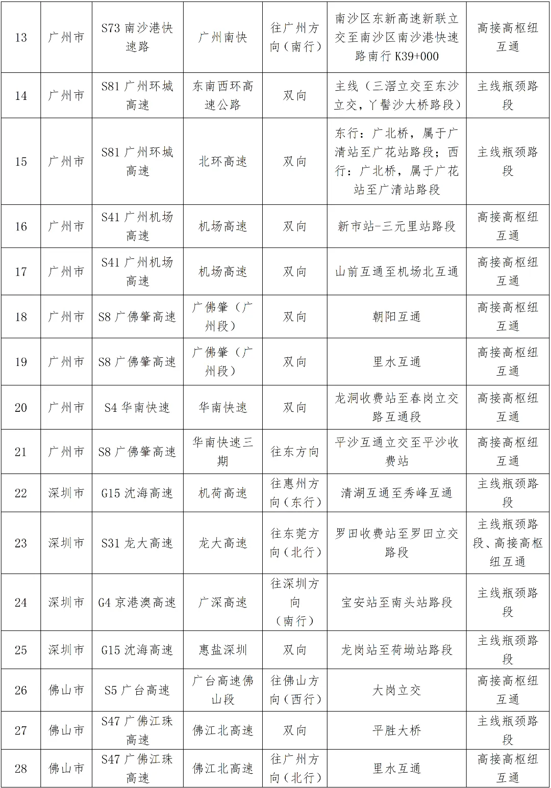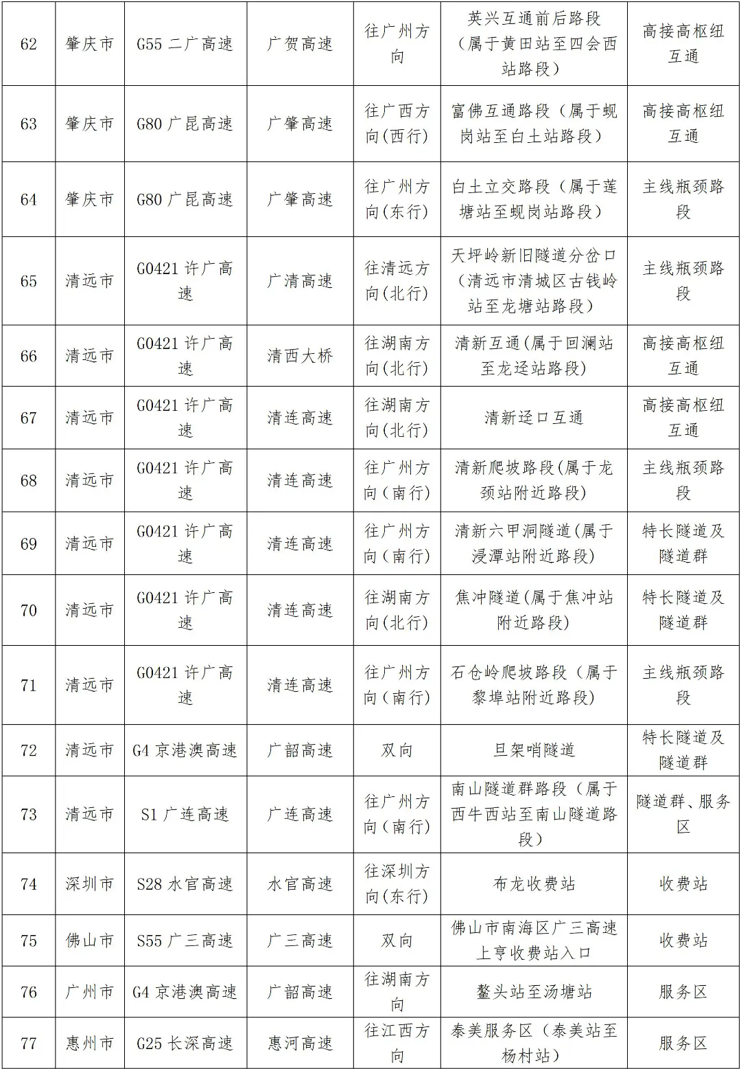 預計繁忙路段一覽表