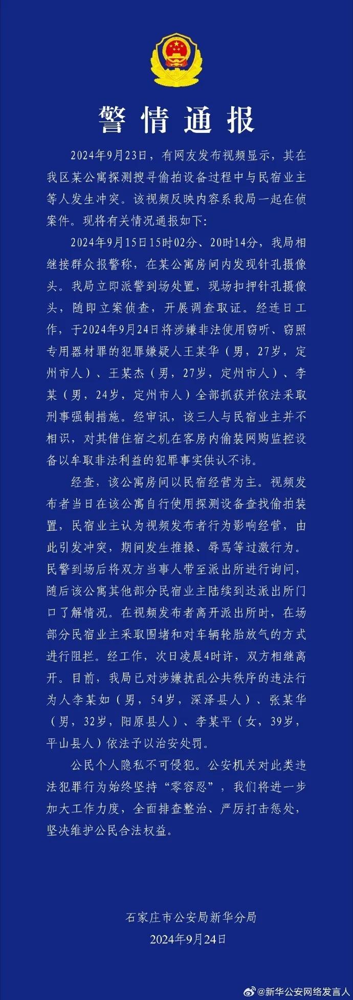 9月24日,石家莊市公安局新華分局發(fā)布警情通報,于2024年9月24日將涉嫌非法使用竊聽、竊照專用器材罪的犯罪嫌疑人王某華(男,27歲,定州市人)、王某杰(男,27歲,定州市人)、李某(男,24歲,定州市人)全部抓獲并依法采取刑事強(qiáng)制措施。