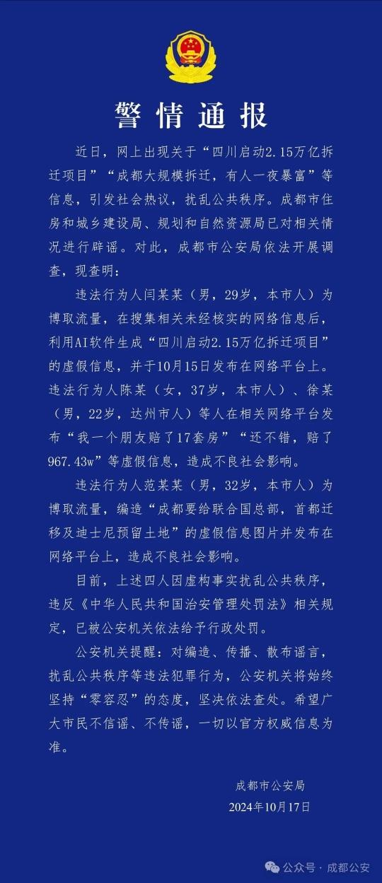 10月17日,成都公安微信公號發(fā)布關(guān)于“四川啟動2.15萬億拆遷項(xiàng)目”“成都大規(guī)模拆遷,有人一夜暴富”等信息的警情通報(bào)。