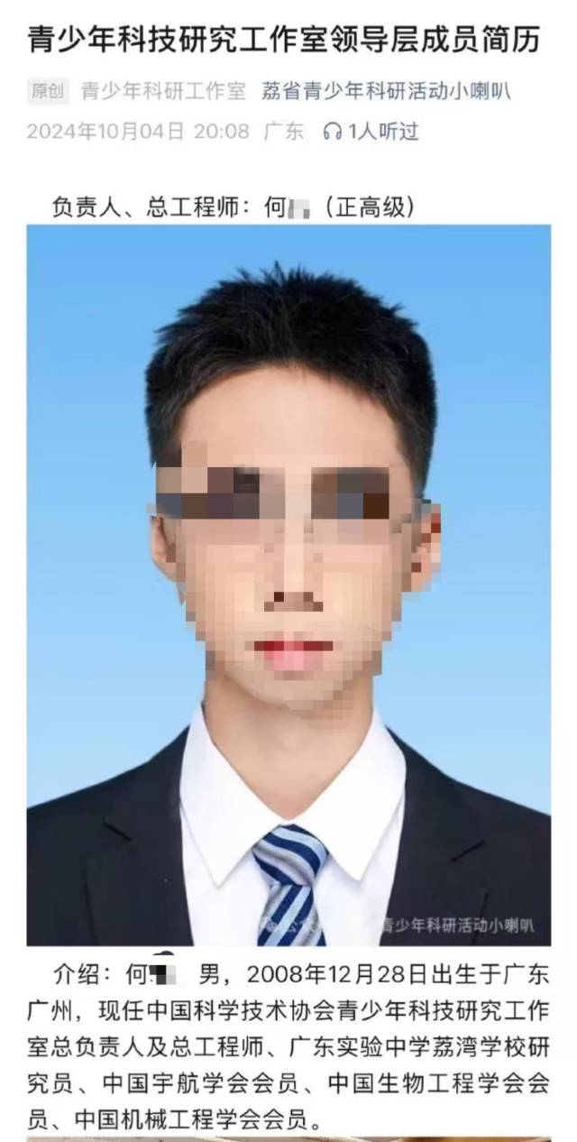 據(jù)名為“荔省青少年科研活動小喇叭”的微信公眾號發(fā)文稱:“何某,男,2008年12月28日出生于廣東廣州,現(xiàn)任中國科學技術(shù)協(xié)會青少年科技研究工作室總負責人及總工程師、廣東實驗中學荔灣學校研究員、中國宇航學會會員、中國生物工程學會會員、中國機械工程學會會員!