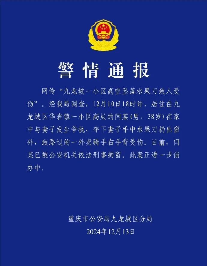網(wǎng)傳“九龍坡一小區(qū)高空墜落水果刀致人受傷”。經(jīng)重慶市公安局九龍坡區(qū)分局調(diào)查,12月10日18時(shí)許,居住在九龍坡區(qū)華巖鎮(zhèn)一小區(qū)高層的閆某(男,38歲)在家中與妻子發(fā)生爭(zhēng)執(zhí),奪下妻子手中水果刀扔出窗外,致路過(guò)的一外賣騎手右手背受傷。