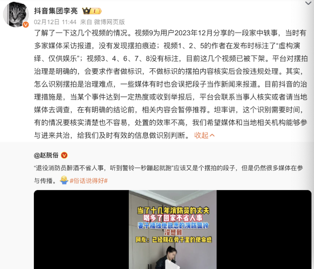 2月12日,抖音集團(tuán)副總裁李亮在微博發(fā)文談及視頻“擺拍”亂象。他表示,平臺(tái)對(duì)擺拍治理是明確的,會(huì)要求作者做標(biāo)識(shí),不做標(biāo)識(shí)的擺拍內(nèi)容核實(shí)后會(huì)按違規(guī)處理。“怎么識(shí)別擺拍是治理難點(diǎn),一些媒體有時(shí)也會(huì)誤把段子當(dāng)作新聞來報(bào)道。目前抖音的治理措施是,當(dāng)某個(gè)事件達(dá)到一定熱度或收到舉報(bào)后,平臺(tái)會(huì)聯(lián)系當(dāng)事人核實(shí)或者請(qǐng)當(dāng)?shù)孛襟w去調(diào)查,在有明確的結(jié)論前,相關(guān)內(nèi)容會(huì)暫停推薦!