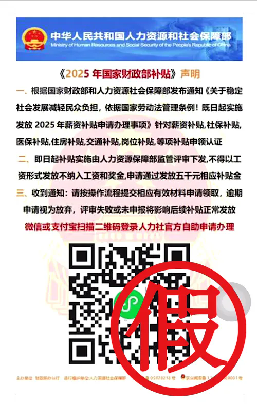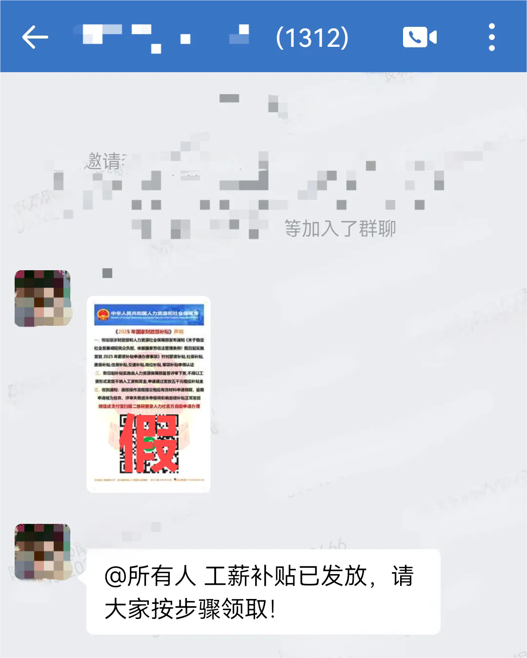 近日,小雪的企業(yè)微信賬號被騙子盜用,同事大強(qiáng)被“小雪”拉入名為“工薪補(bǔ)貼”的企業(yè)微信群聊,隨后“小雪”在群內(nèi)發(fā)布了一張圖片,圖片上有“中華人民共和國人力資源和社會(huì)保障部”“《2025年國家財(cái)政部補(bǔ)貼》聲明“微信或支付寶掃描二維碼登錄人力社官方自助申請辦理”等字樣