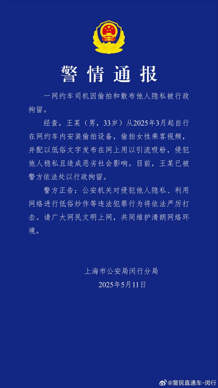 據(jù)@警民直通車-閔行 微博消息,5月11日,上海市公安局閔行分局發(fā)布警情通報:一網(wǎng)約車司機因偷拍和散布他人隱私被行政拘留。