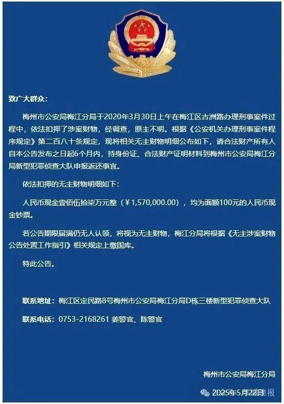 5月22日,廣東梅州市公安局梅江分局發(fā)布公告稱,該局于2020年3月30日上午在梅江區(qū)古洲路辦理刑事案件過程中,依法扣押了涉案財物,經調查,原主不明。