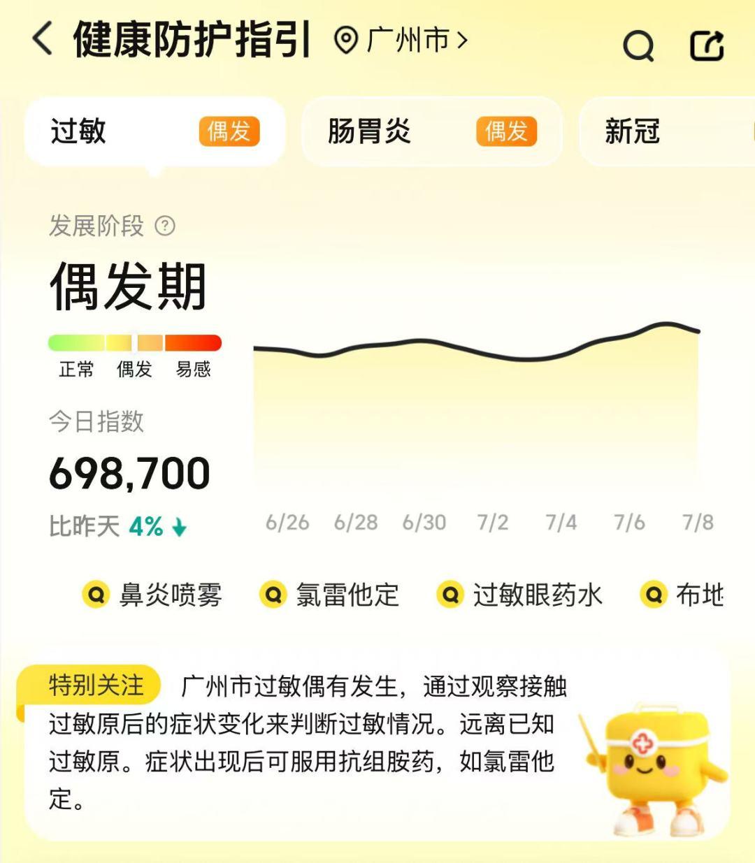 美團(tuán)買藥發(fā)布的廣州健康防護(hù)指引提示:當(dāng)前過敏偶有發(fā)生,癥狀出現(xiàn)后可以服用抗組胺藥,如氯雷他定等;急性腸胃炎也偶有發(fā)生,可以使用口服補(bǔ)液鹽、止瀉藥,如蒙脫石散等緩解不適。