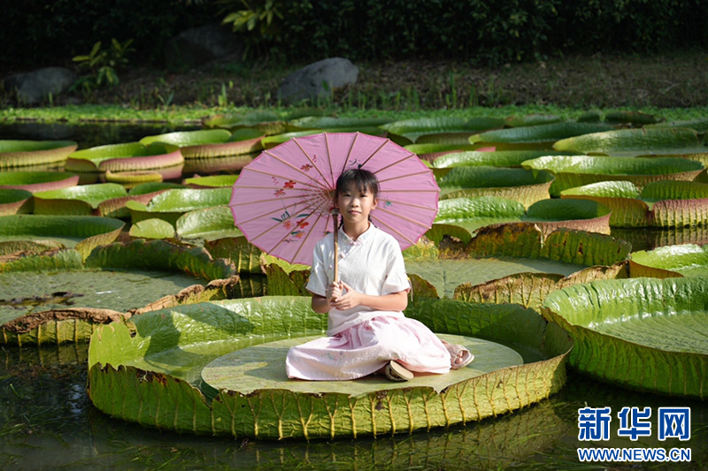 盛開的王蓮可托起小朋友。新華網(wǎng)發(fā)(全碧芳 攝)
