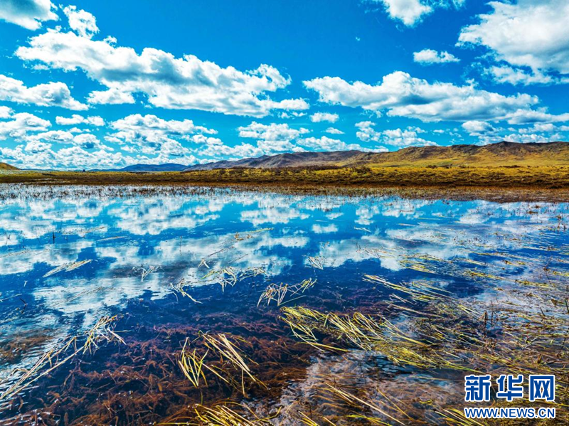 漫澤塘濕地湖水倒映著潔白的云彩。新華網(wǎng)發(fā)(夏雪東爾 攝)