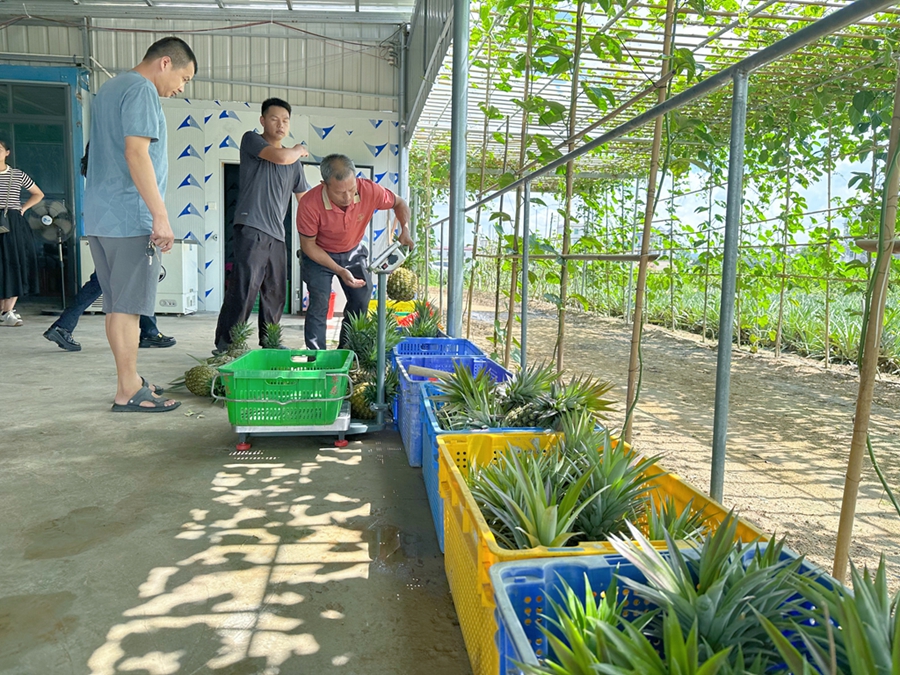 工作人員將采摘的鳳梨稱重。