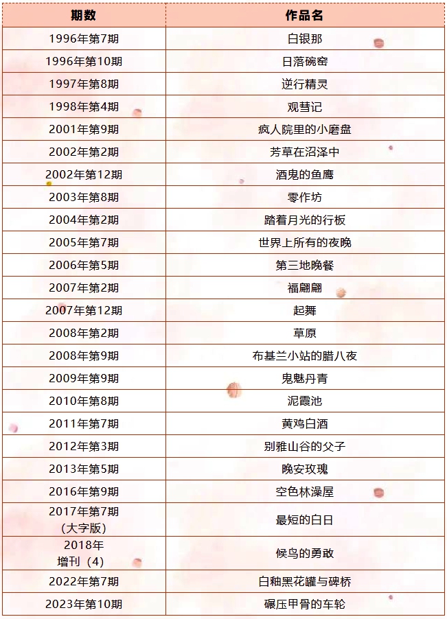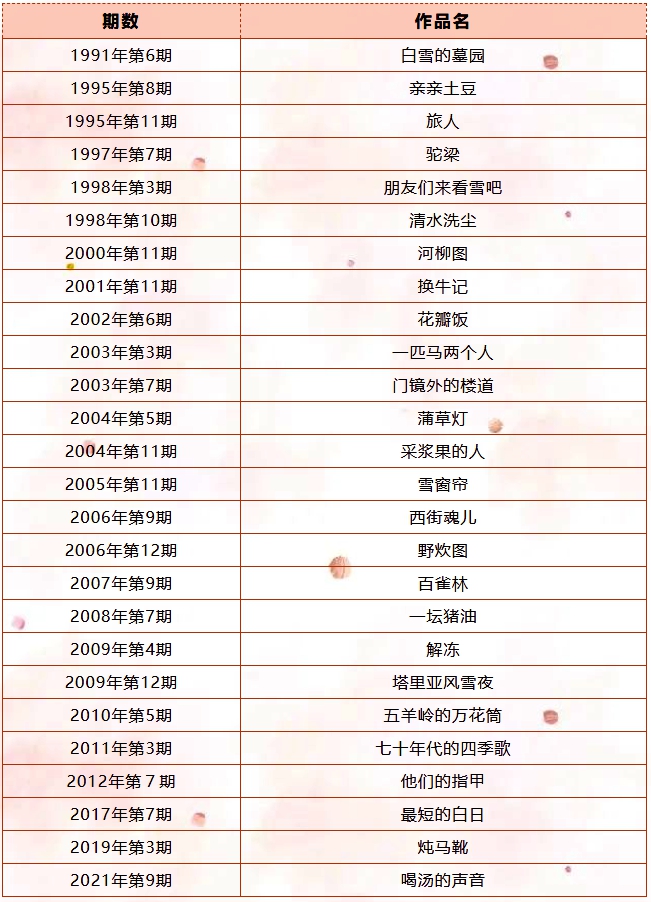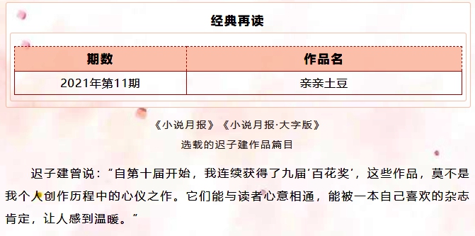 1991年,《小說月報》第6期選載了遲子建的短篇小說《白雪的墓園》,1995年第8期又選載了短篇小說《親親土豆》,并獲第七屆《小說月報》百花獎短篇小說獎。自此,遲子建與《小說月報》和百花獎的緣分拉開帷幕,此后遲子建多次獲百花獎。