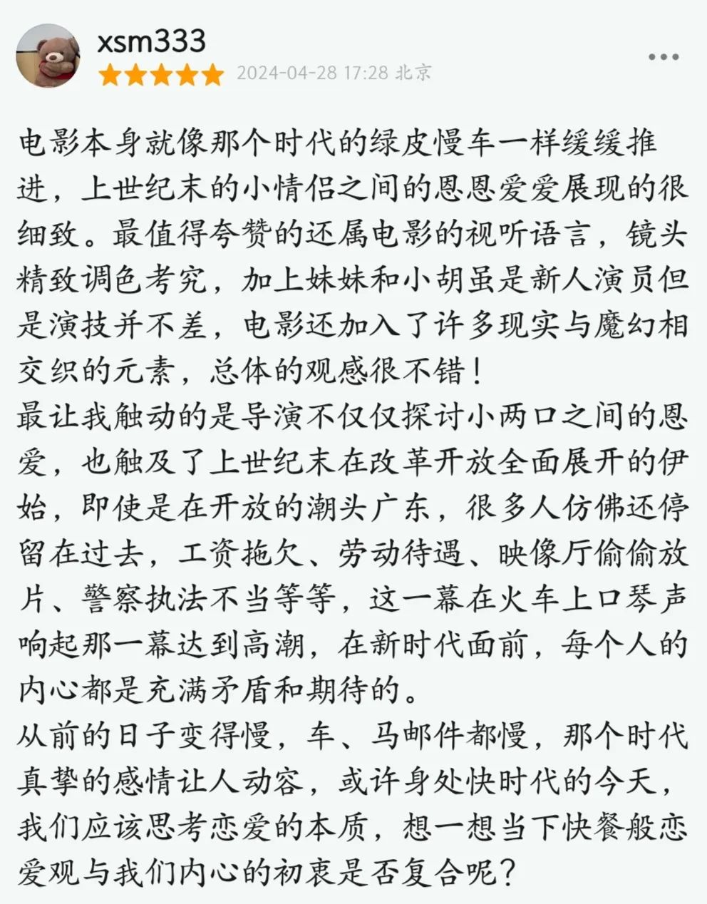 影片故事來自上世紀(jì)90年代,主角林秀珊(張子楓飾)、王銳(胡先煦飾)是在村里一起長大的青梅竹馬,也是一對迫于生計的新婚夫妻,因工作分隔兩地,他們每次只能在假期時化身為“純愛戰(zhàn)士”,乘坐好幾個小時的綠皮慢車去見對方一面。