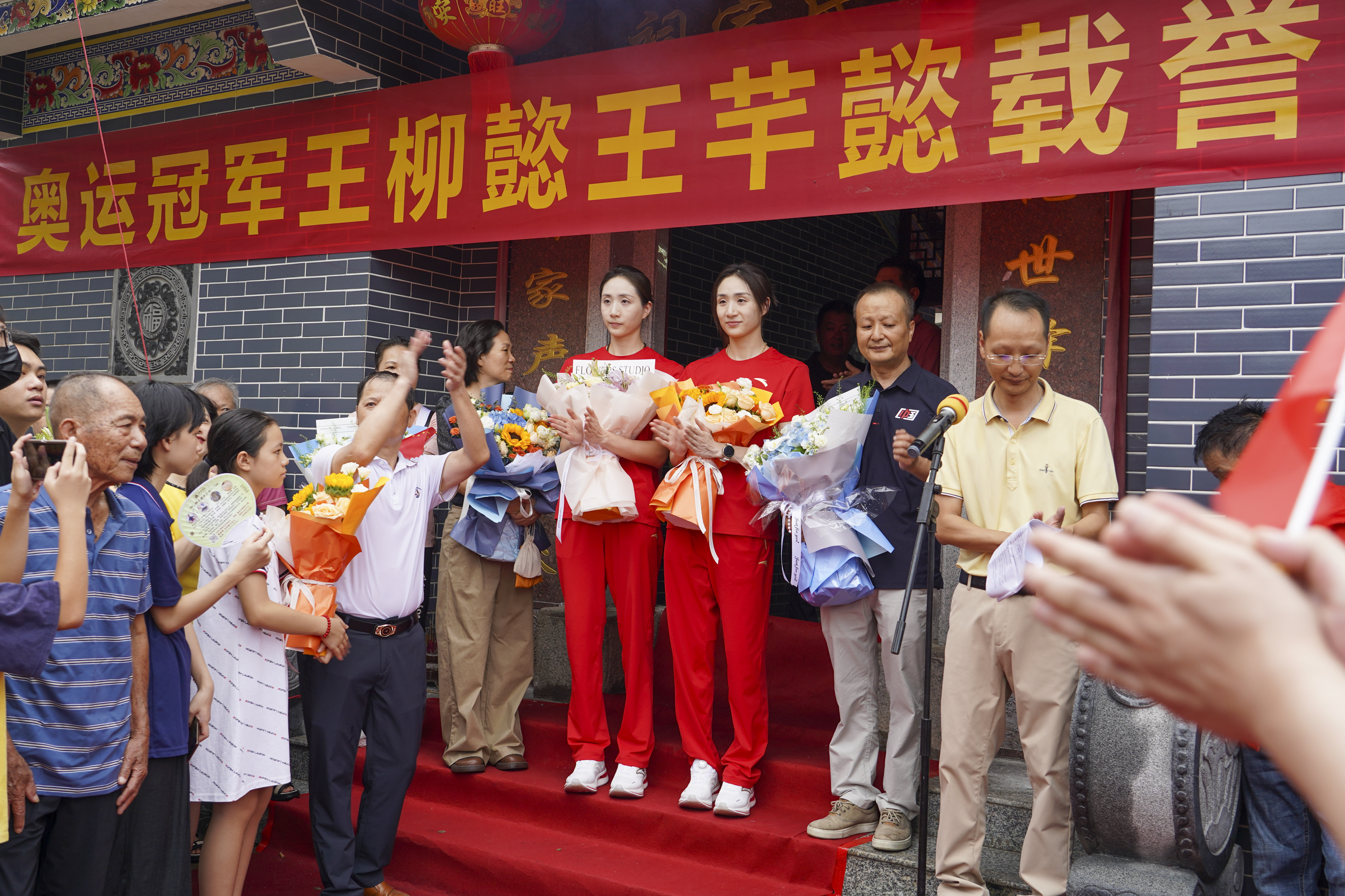 得知兩位奧運(yùn)冠軍即將榮歸故里,村民們自發(fā)組織起歡迎隊(duì)伍,手持鮮艷的小紅旗,臉上洋溢著自豪與喜悅的笑容,在王氏宗祠外翹首以盼。小朋友們也列隊(duì)迎接。當(dāng)王柳懿、王芊懿出現(xiàn)時(shí),村民們爭(zhēng)相獻(xiàn)上鮮花,歡呼聲此起彼伏,“兩姐妹太棒了,好樣的!”“汝湖的驕傲!”等贊美聲不絕于耳,場(chǎng)面熱鬧而溫馨。