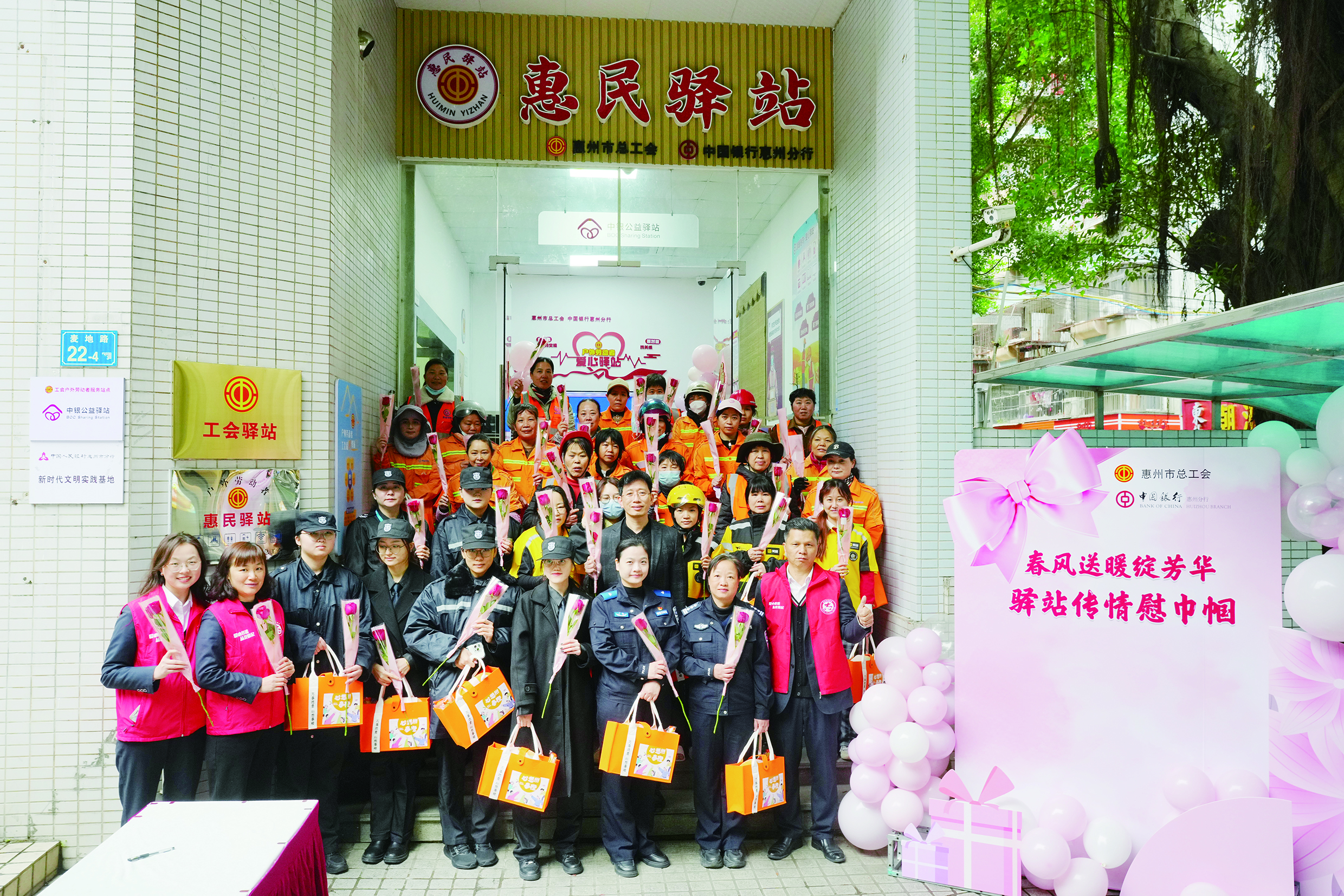 人間最美三月天,春花爛漫綻新顏。為了加強對女性戶外勞動者關(guān)心關(guān)愛,在第115個“三八”國際勞動婦女節(jié)到來之際,3月6日上午,惠州市總工會聯(lián)合中國銀行惠州分行(以下簡稱“惠州中行”)在惠州中行惠民驛站開展“春風送暖綻芳華 驛站傳情慰巾幗”關(guān)愛活動,吸引50多名來自環(huán)衛(wèi)、外賣、協(xié)警、安保等行業(yè)的女性戶外勞動者前來參加。